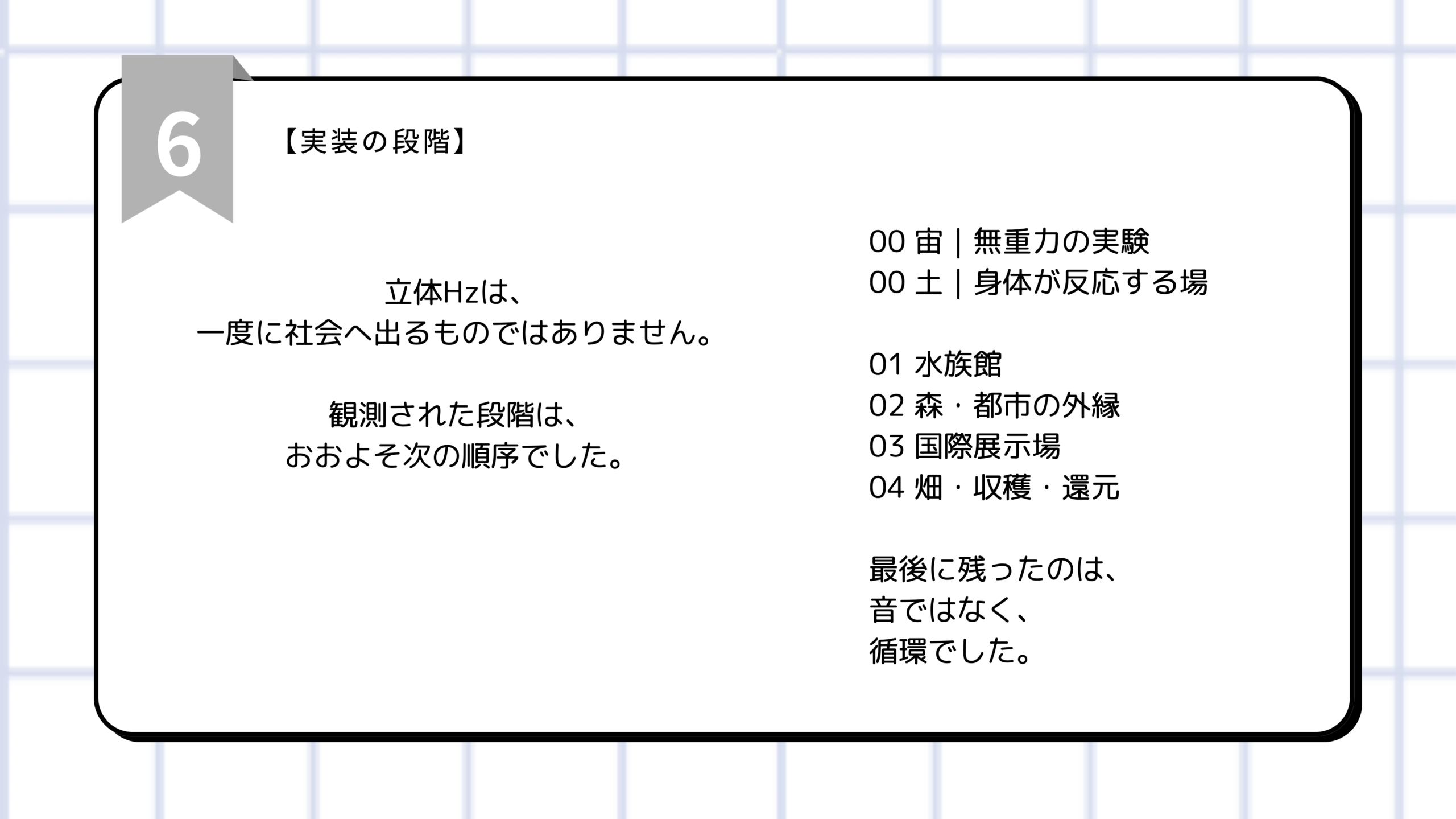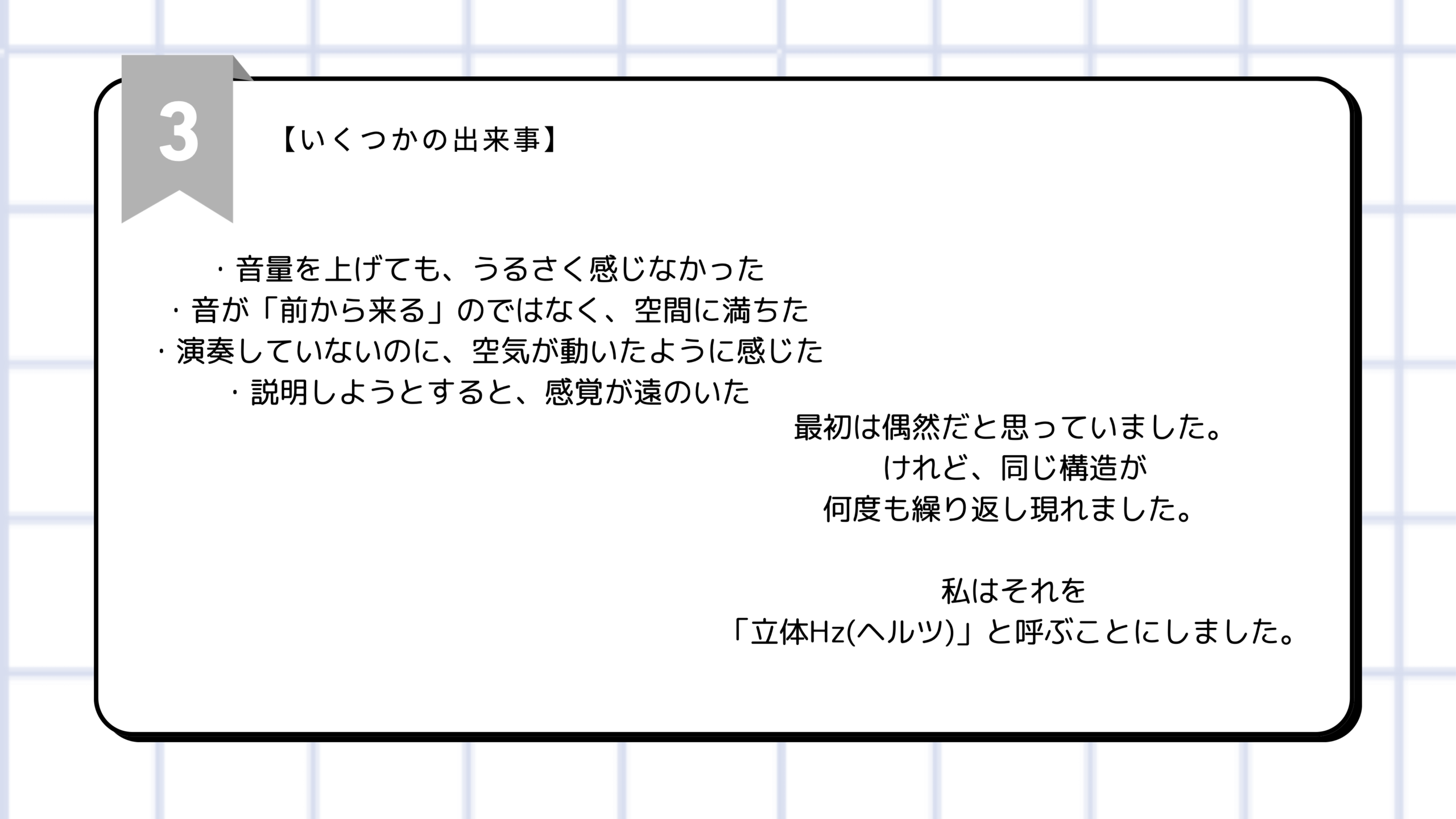 立体Hz では、音楽を「イベント」で終わらせず、疲弊した生活に戻っていく「再生のエネルギー」として再定義します。